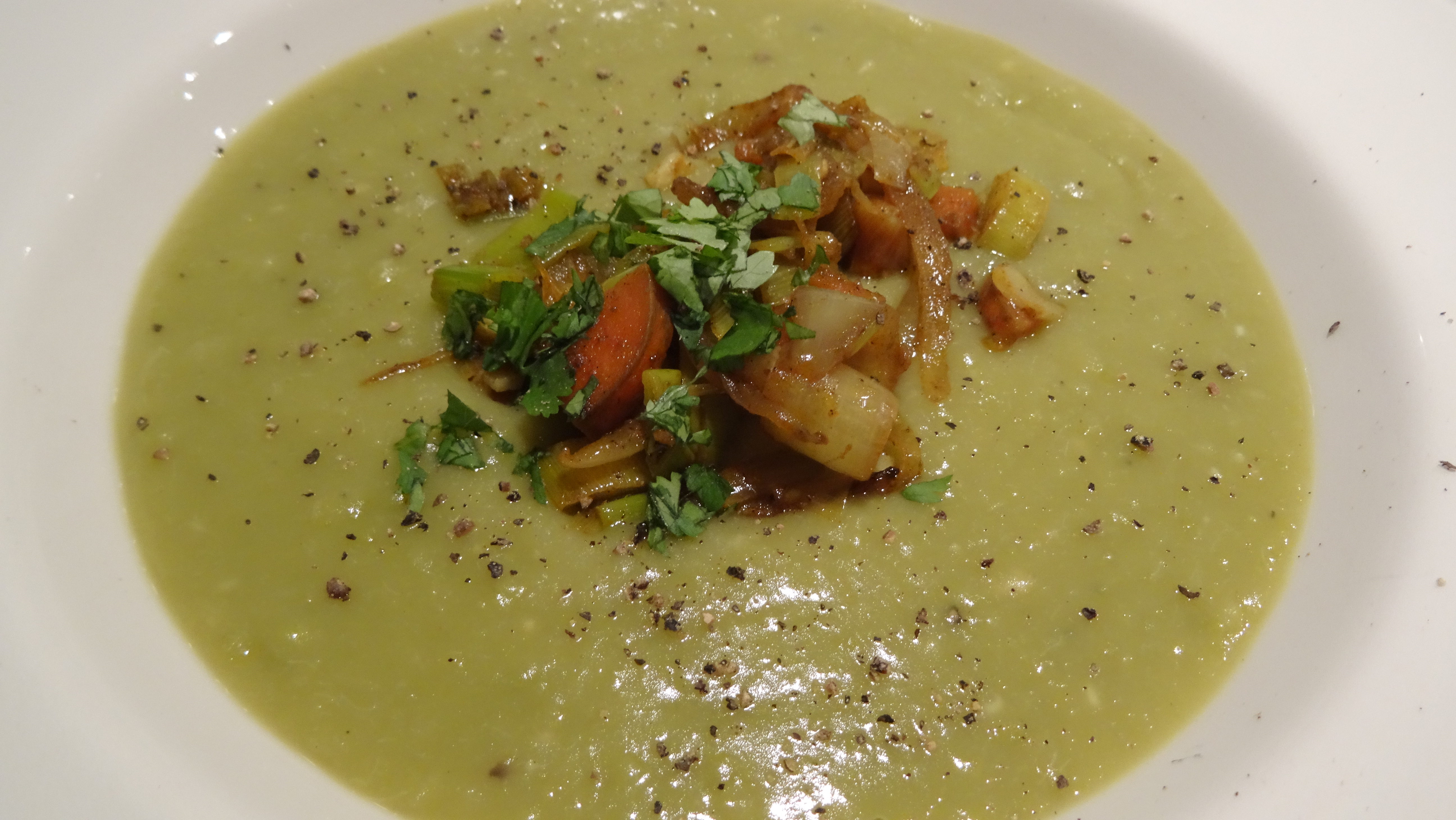 - Serveer de erwtensoep zo warm mogelijk en strooi er vlak voor het serveren ruim verse gehakte koriander over.