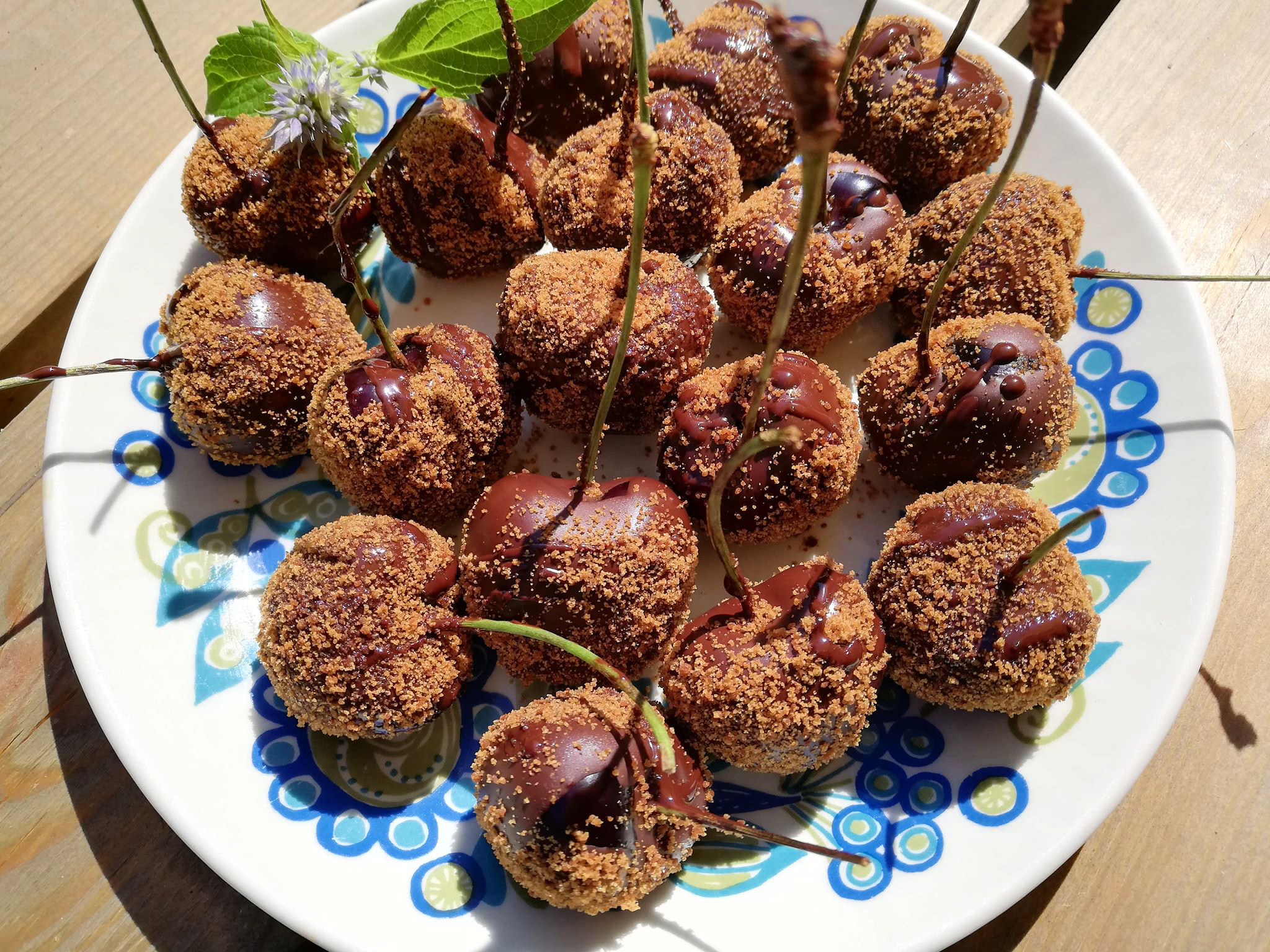 - Als de bonbons niet meer druppelen kun je ze (ook weer aan het steeltje) oppakken en in de kokosbloesemsuiker dopen. Bedek als het lukt (en als je dat lekker vindt) ook de zijkanten een beetje met de suiker. Een alternatieve manier is: schep wat kokosbloesemsuiker in een theezeefje en zeef de suiker door tegen het zeefje te tikken over de kersen op het rooster.