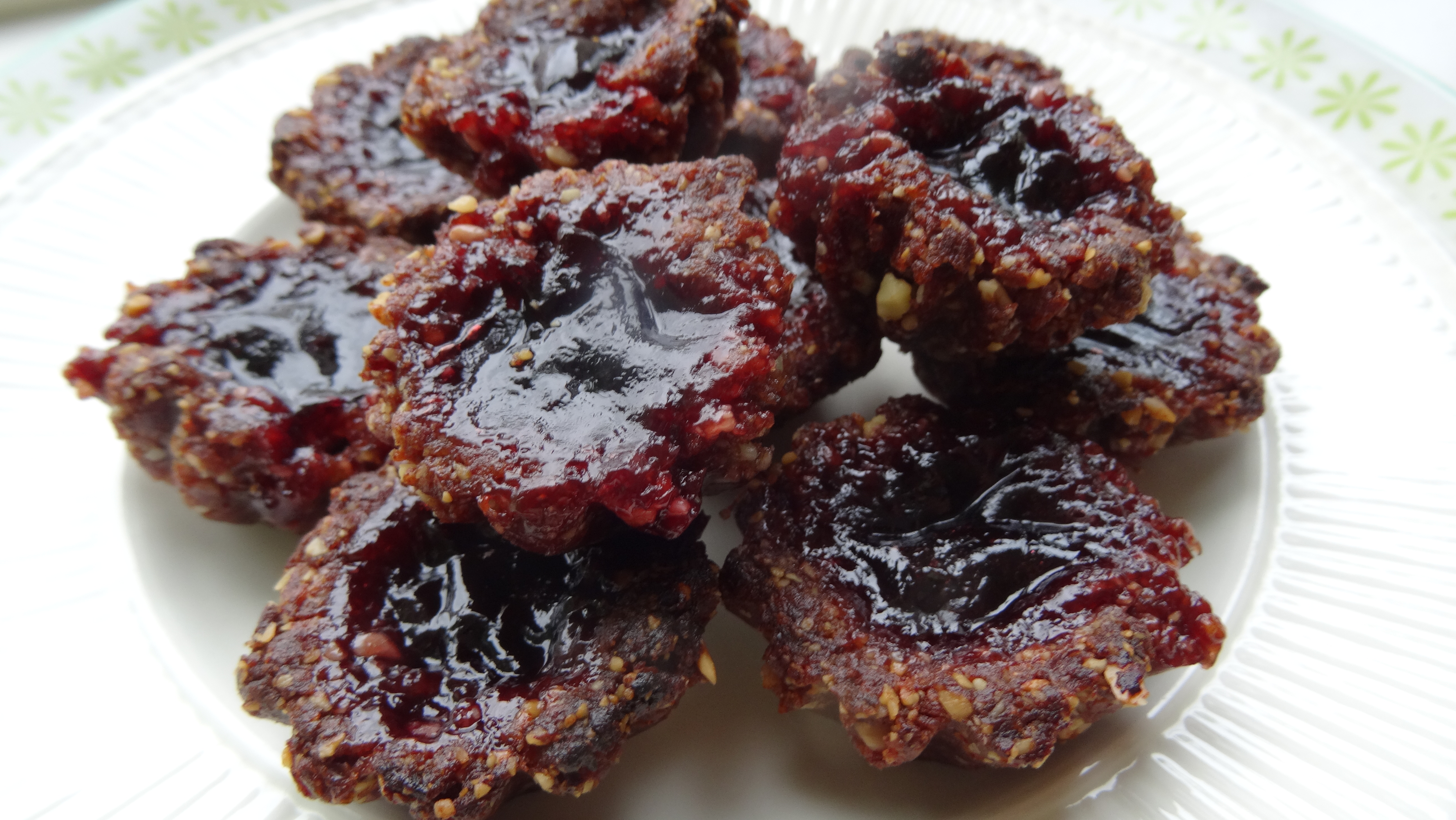 - Schep een theelepeltje kersenjam in het kuiltje (zonder geraffineerde suiker natuurlijk!) en bak de koekjes 10 minuten in een voorverwarmde oven op 200 ºC.