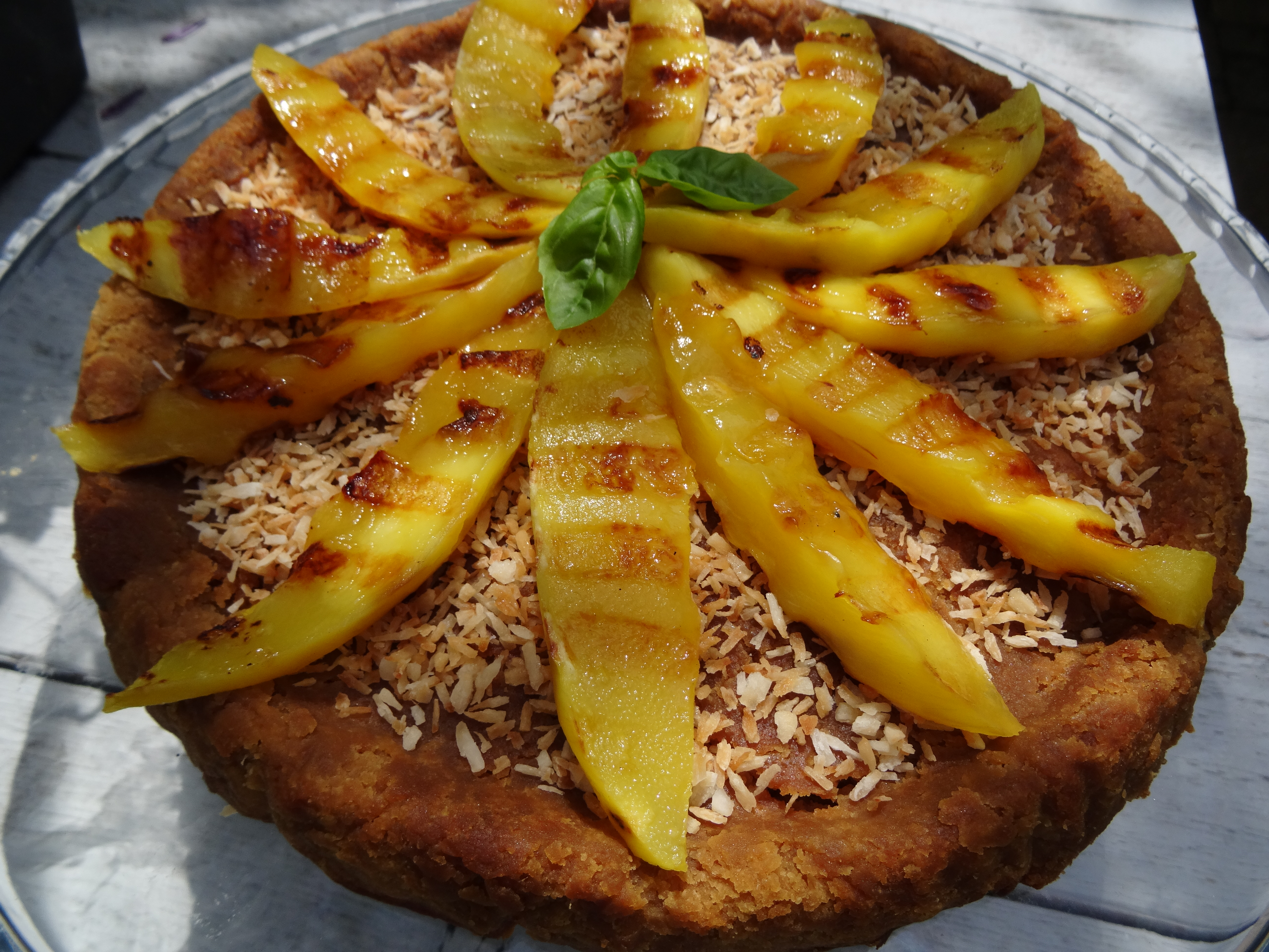 - Laat de cake afkoelen en leg ‘m op een mooie schaal. Bestrijk de cake desgewenst met wat extra rijststroop. Beleg de cake met de geroosterde kokos en met de plakken gegrilde mango. Garneer met een takje munt of basilicum.