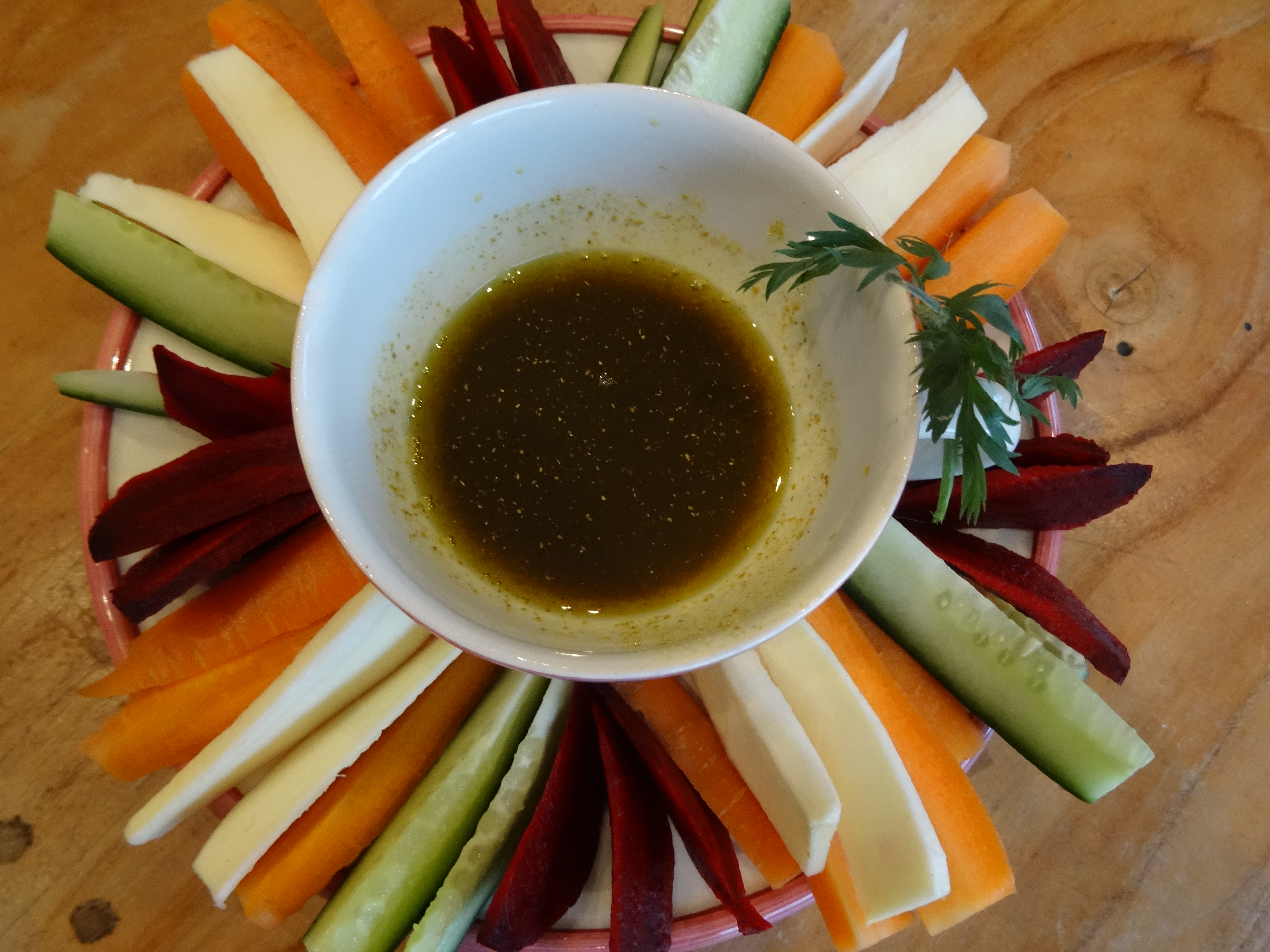 • Schik de groenten op een schaal en zet de kruidige olie in het midden.