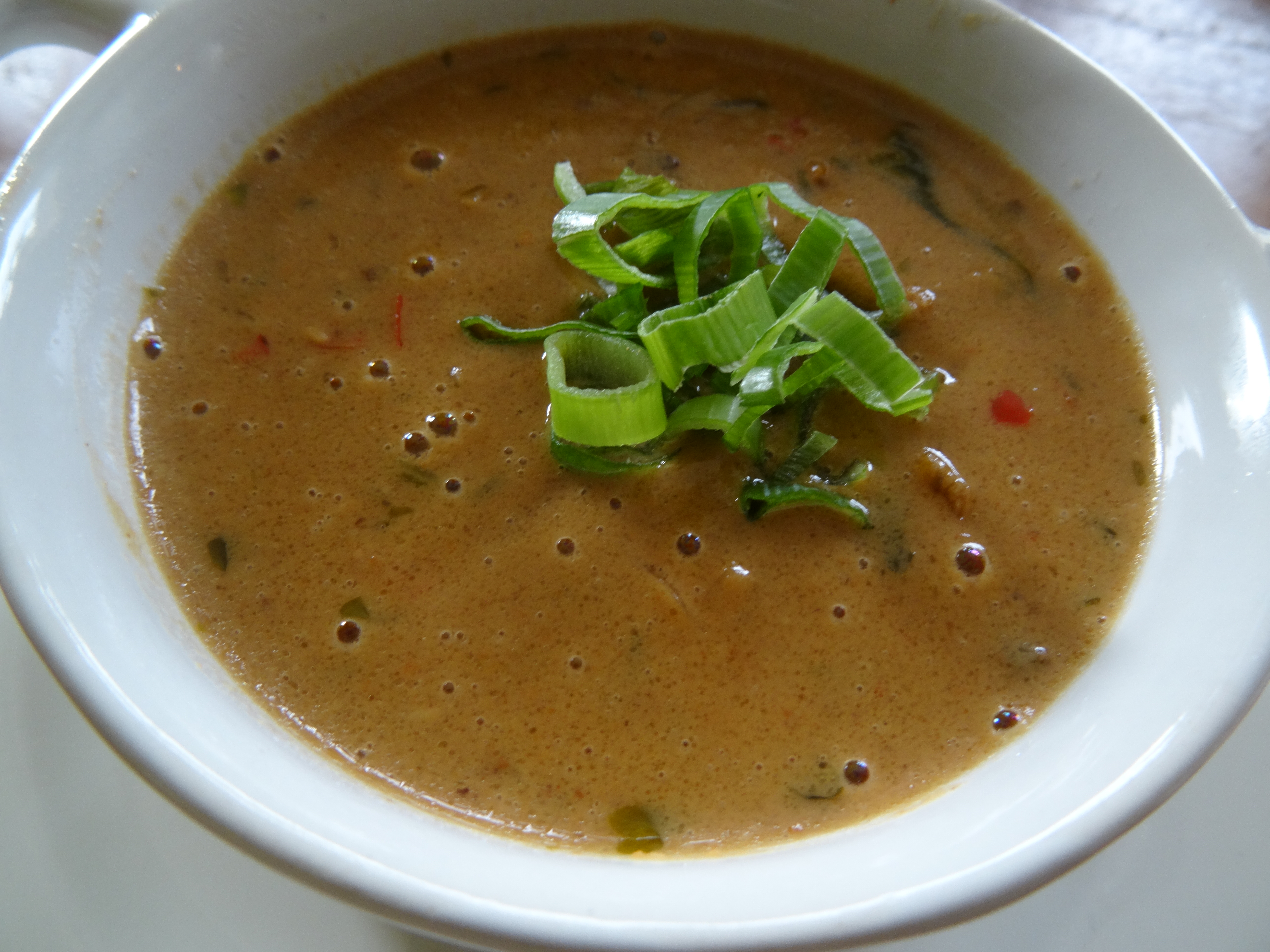 • Proef de soep en voeg eventueel nog wat versgemalen peper of tamari toe. Serveer de soep met fijngesneden lente-ui.