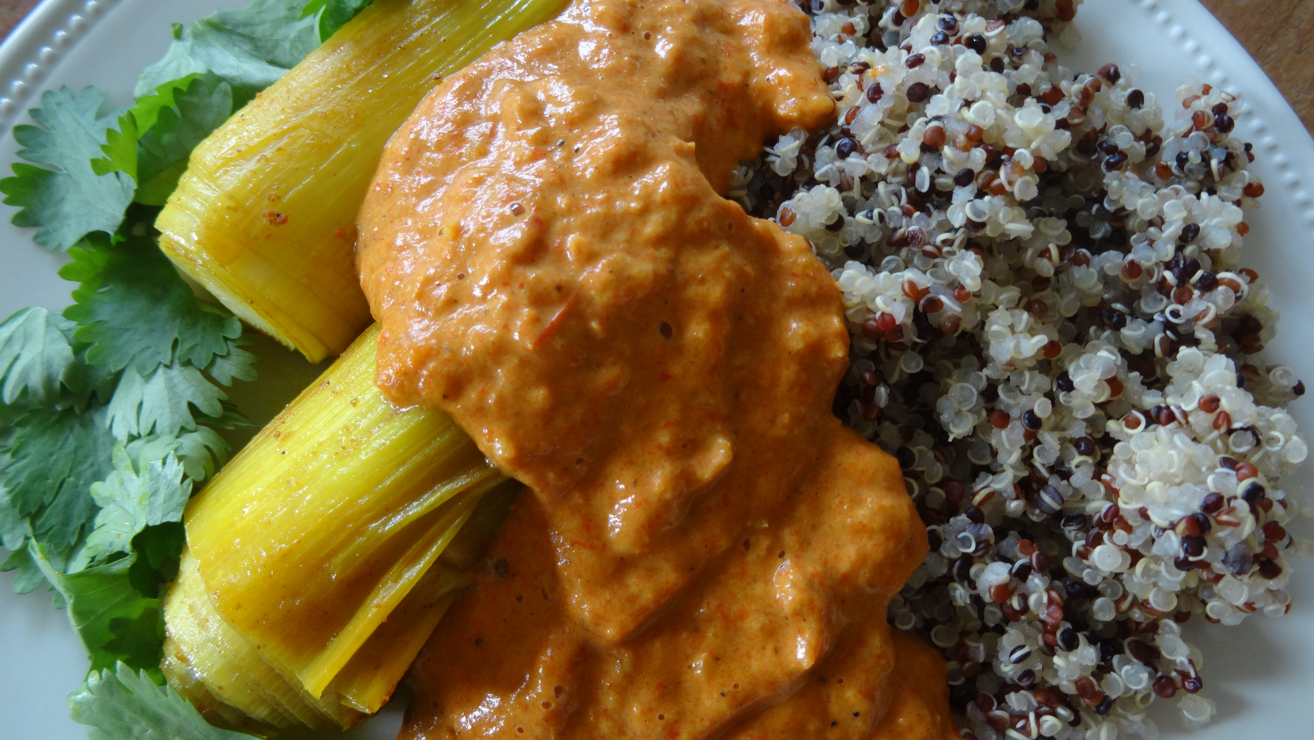 - Proef of de saus voldoende op smaak is en voeg indien nodig nog wat specerijen of zeezout toe. Serveer de prei met de romige paprika-uiensaus en garneer naar wens met peterselie of koriander. Met een lekker frisse salade en bijvoorbeeld quinoa (op de foto quinoa-mix)) is je gerecht helemaal áf.