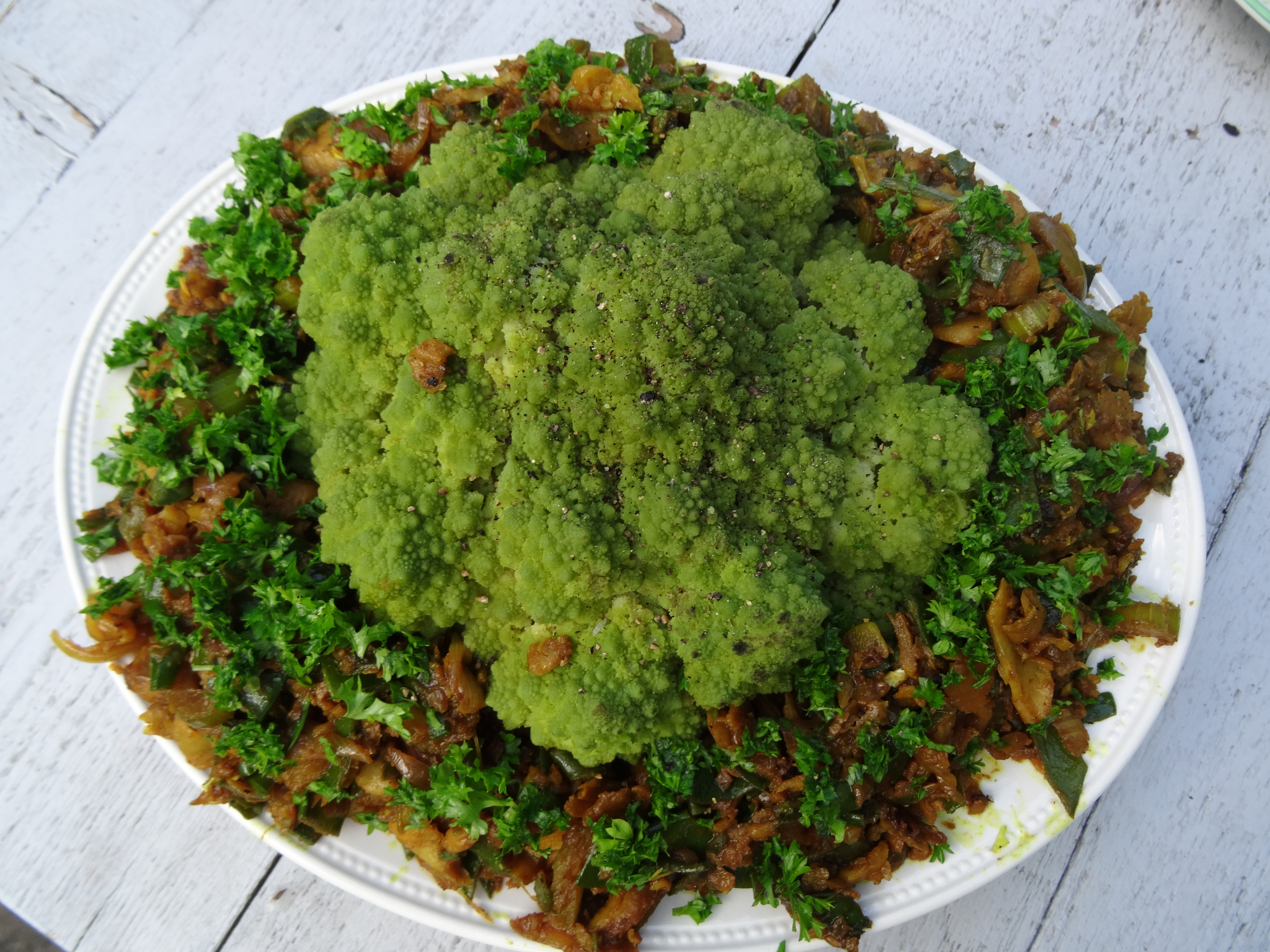 - Serveer de romanesco in zijn geheel. Vis ‘m daarvoor met een schuimspaan voorzichtig uit het kookwater en leg ‘m op een grote schaal. Schep het visgerecht om de romanesco heen en strooi er de gehakte peterselie overheen. Serveer dit gerecht met een verse rauwkostsalade.