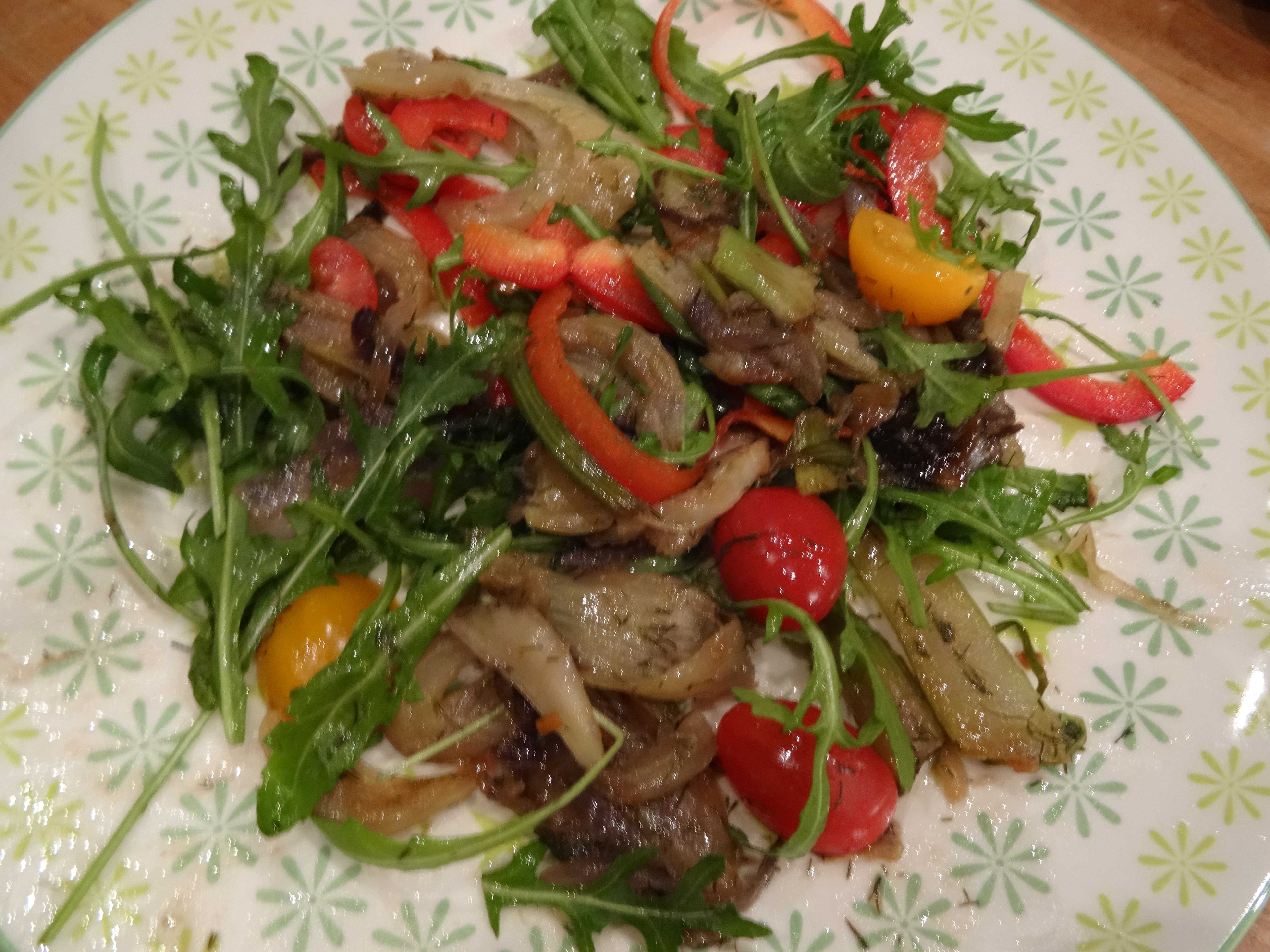 • Laat de groenten gaar stoven en voeg indien nodig nog wat water toe. Meng de gestoofde venkel met rode ui met een lekkere salade van rucola, snoeptomaatjes en paprika. Gebruik het vocht van de gestoofde groenten als dressing. Proef even en maak het eventueel nog extra op smaak met versgemalen peper en specerijen of verse kruiden die je lekker vindt.
