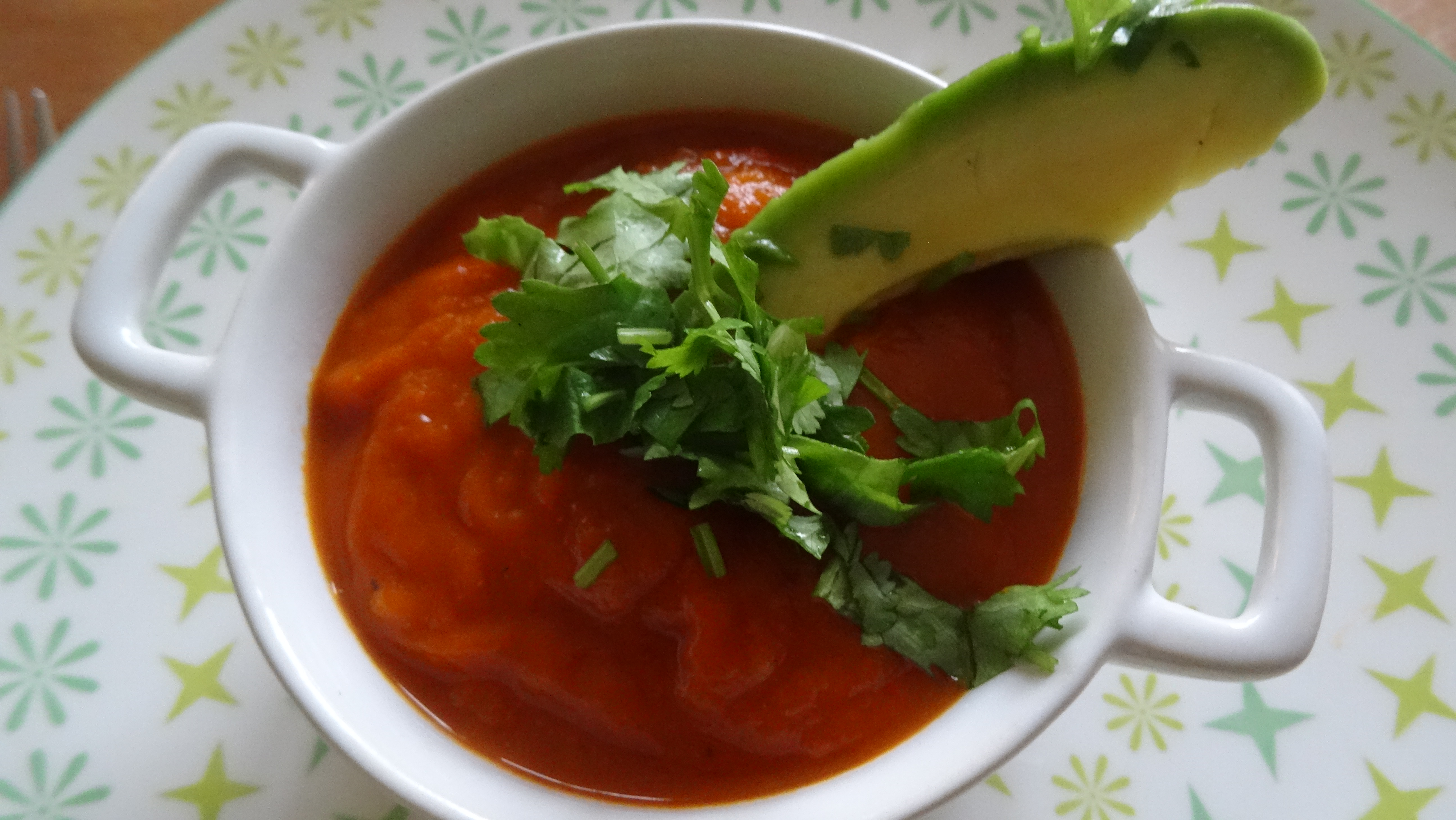 - Serveer de soep eens met een mooie schijf avocado er schuin in en met gehakte verse koriander erover gestrooid.
