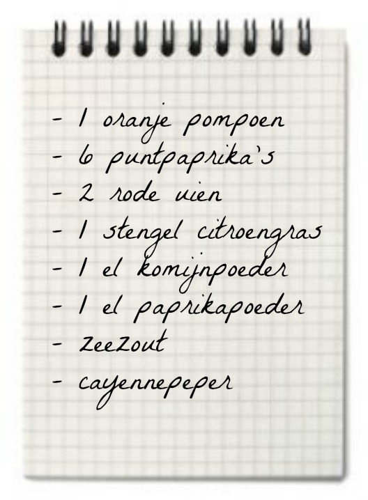 - Bak twee rode uien in een ruime pan, met een scheutje extra vergine olijfolie of kokosolie tot ze glazig zien. Voeg de komijn en het paprikapoeder toe. Kneus de stengel citroengras in een vijzel en doe deze bij de uien. Ontdoe de paprika’s van de geblakerde velletjes en voeg deze samen met de pompoen (inclusief schil) toe aan de uien. Vul de pan met water tot de groenten net onder staan. Voeg royaal (Keltisch) zeezout toe en een snufje cayennepeper. Laat de soep een kwartiertje pruttelen. Haal de stengel citroengras uit de soep en gooi deze weg. Pureer de soep dan met een staafmixer of in de keukenmachine. Even proeven is slim, want misschien is er nog wat zout of peper nodig.