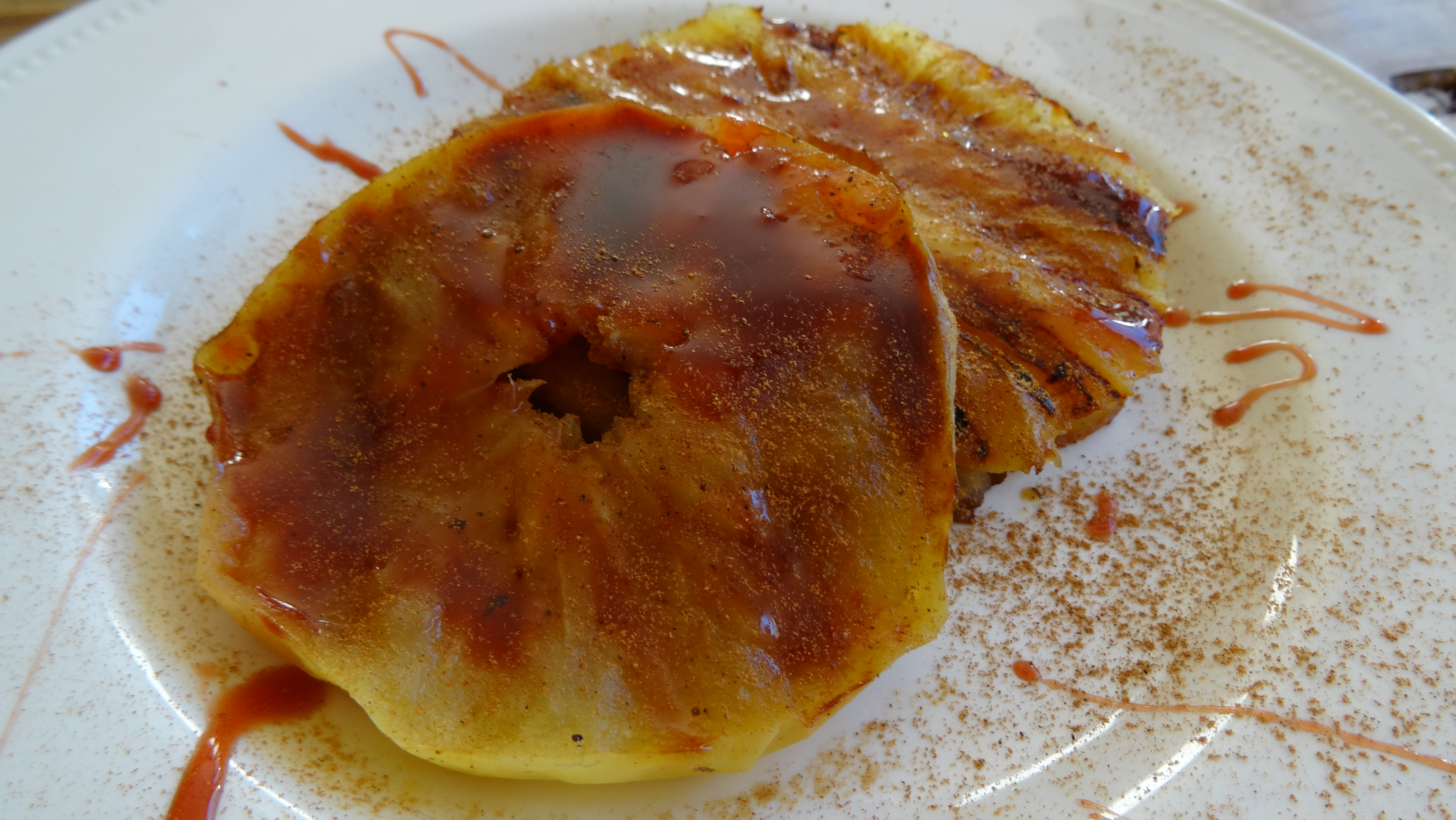 - Als het fruit gegrild is leg je het plat weg om af te koelen of, als je het warm wilt eten, leg je het op een mooi bordje. Bestrooi het fruit met een theelepel koekkruiden en lepel er wat dadelstroop overheen.