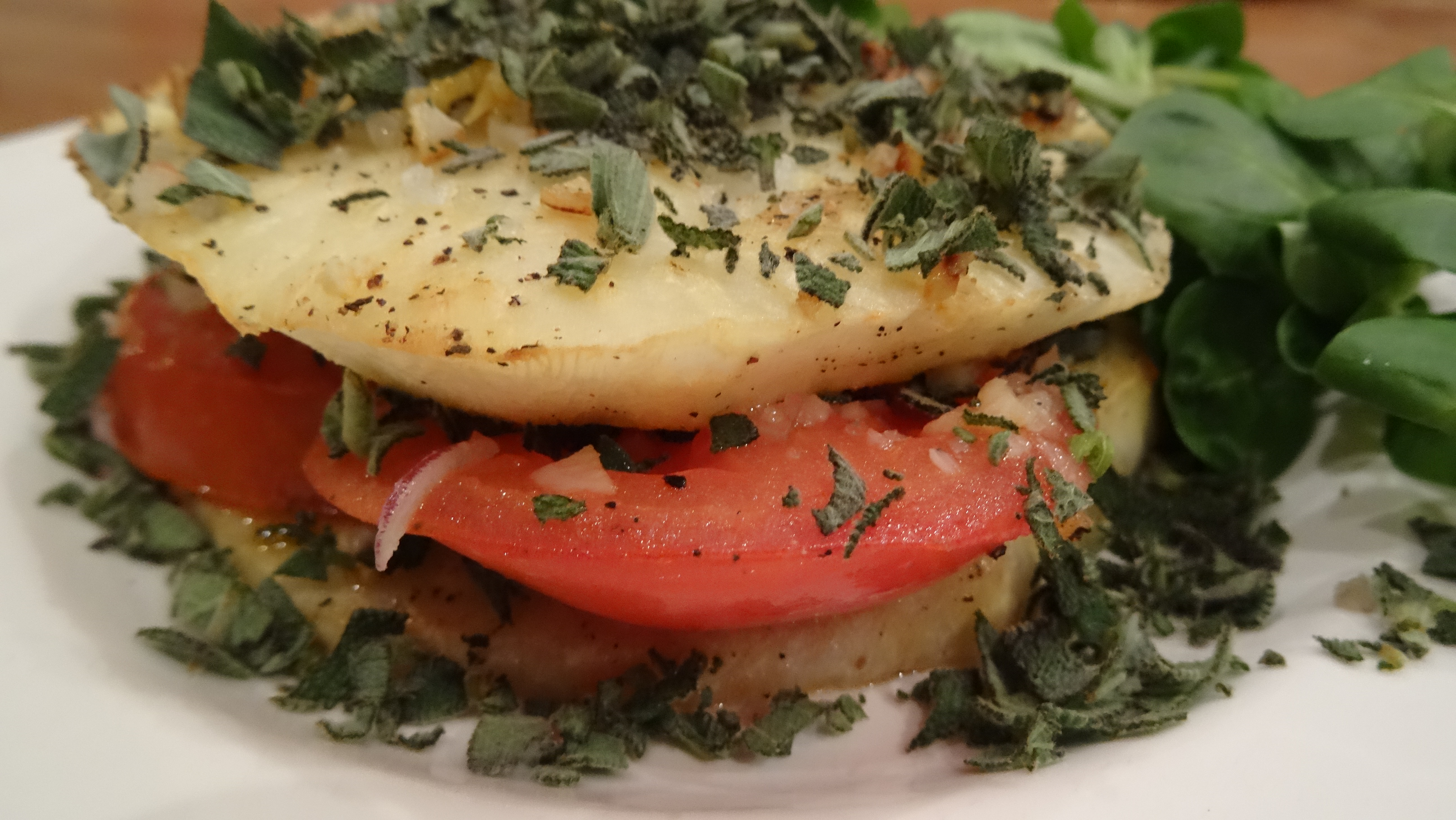 - Serveer de groenten als torentje door eerst een knolselderijplak op een bord te leggen, daarna de gebakken tomaat en tot slot weer een plak knolselderij. Bestrooi het torentje royaal met fijngehakte verse salie, rozemarijn of oregano.